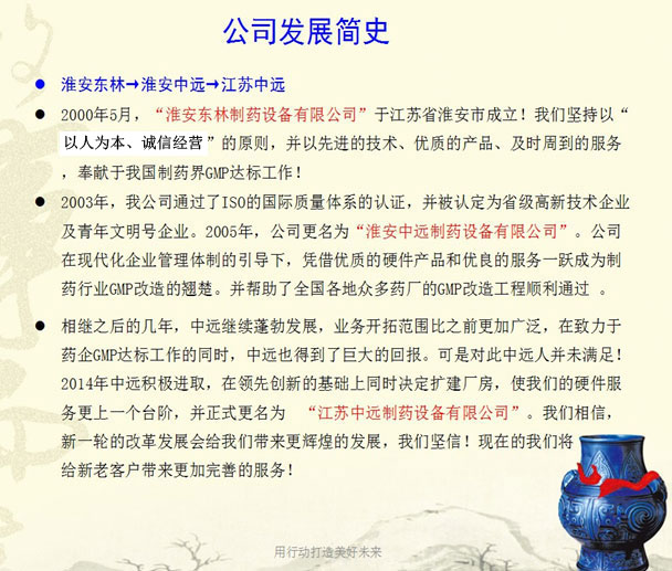 2003年,我公司通过了ISO的国际质量体系的认证,并被认定为省级高新技术企业及青年文明号企业。2005年,公司更名为“淮安中远制药设备有限公司”。公司在现代化企业管理体质的引导下,凭借较好的硬件产品和优良的服务一跃成为制药行业GMP改造的翘楚。并帮助了全国各地众多药厂的GMP改造工程顺利通过。
