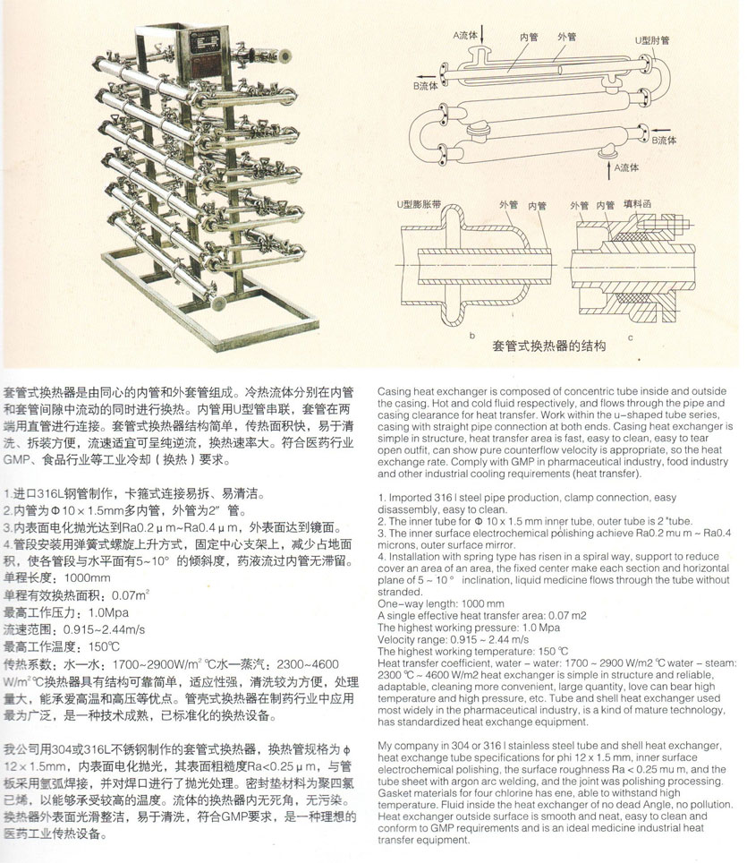 套管换热器是由同心的内管和外套管组成。冷热流体分别在内管和外套管环隙中流动的同时进行传热。内管用U形串联,套管用直管段连接。套管式换热器结构简单,传热面积易增减,清洗拆装方便,流速适宜可呈纯逆流,传热速率大。 设备采用SUS316L或SUS304不锈钢制造,内管为DN25,外套管为DN50,管段之间全部使用卡箍连接,拆装方便,管段安装呈螺旋上升,换热管都固定在中心的支撑架上。减小了占用面积,又使各管段有了与水平面5~10度的倾斜角,从而保证了换热器内管路无死角,药液流过内管时无滞留。因此,此种套管换热器是用于药液快速冷却的理想设备。